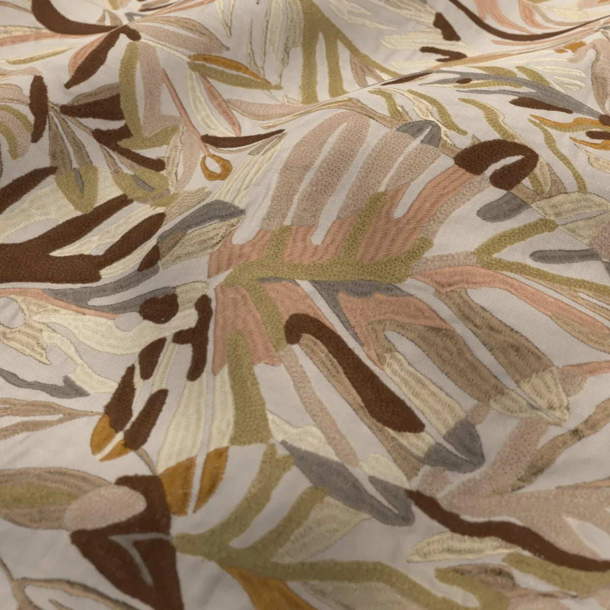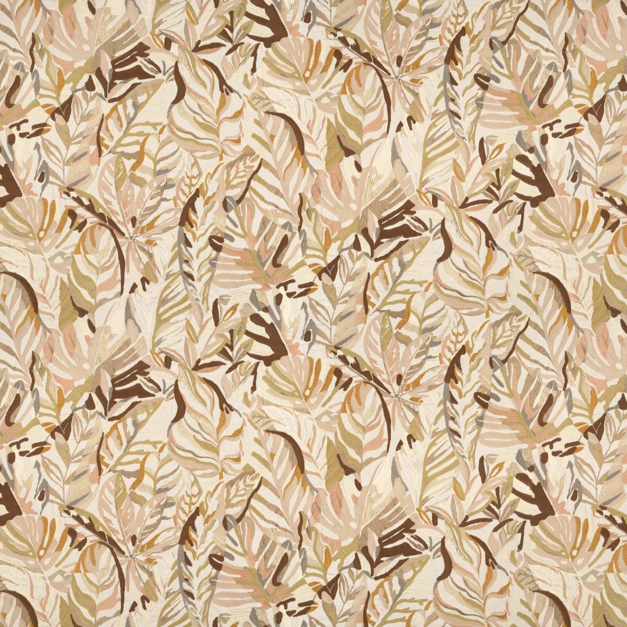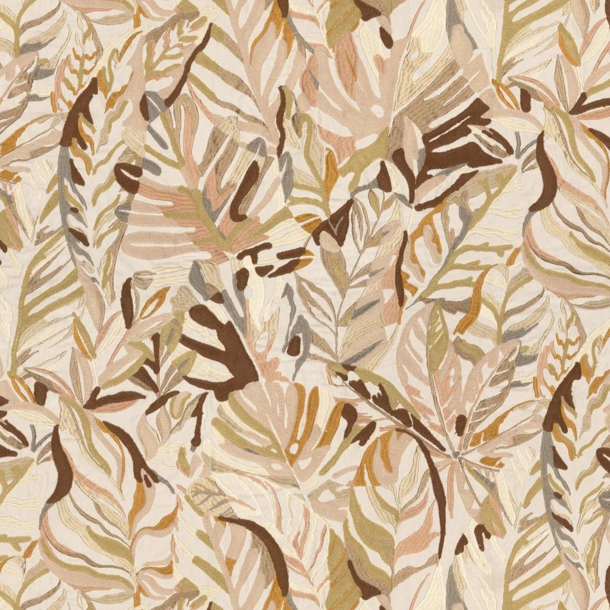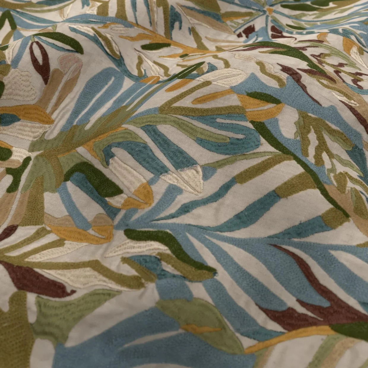 Cordia, our hero design, reimagines tropical foliage in an elevated expression of paradise for the modern interior. A collage of leaves unfurls across the natural linen base cloth, combining crewel chain stitching with a dynamic interplay of matte and lustrous yarns to create depth and tactility. Two rich colourways bring artisanal texture to drapery and accessories. Raffia captures the warm island glow in soft blush, warm gold, and terracotta tones, punctuated by burgundy on a barely-there pink base. Lagoon, by contrast, channels cool, coastal serenity, melding foliage greens with sky blue and ocean teal atop a pumice-hued ground.