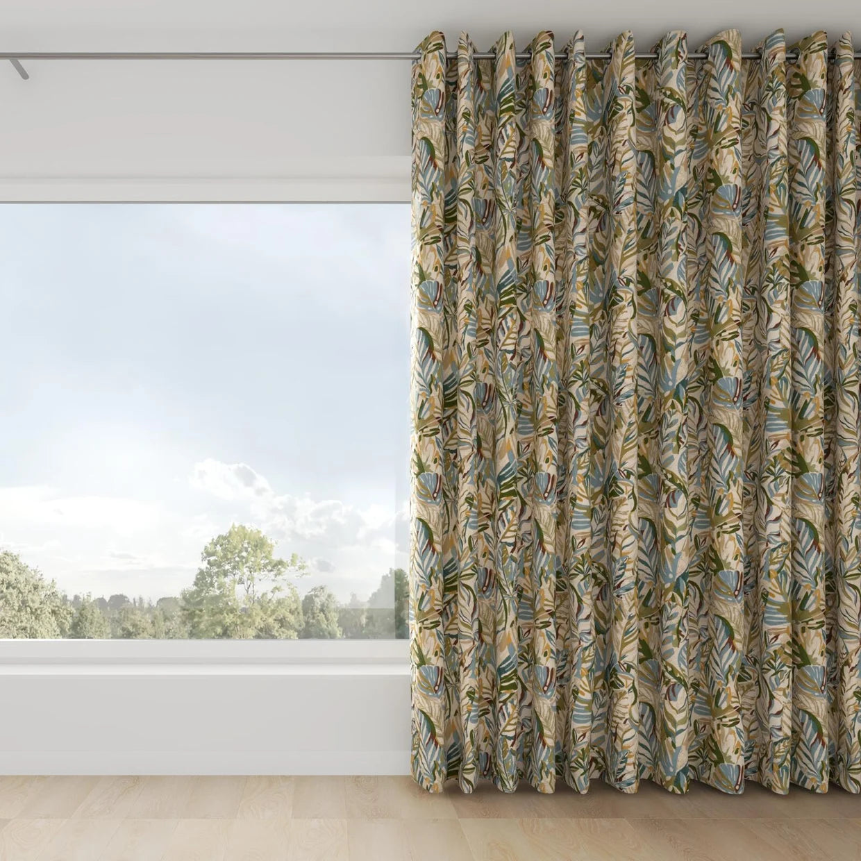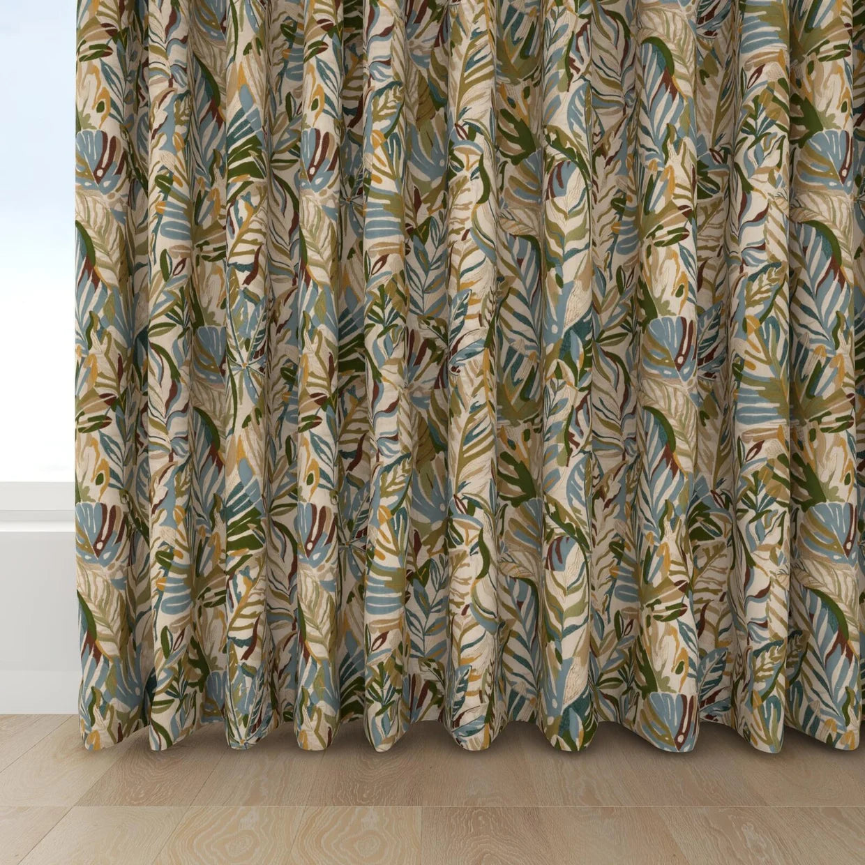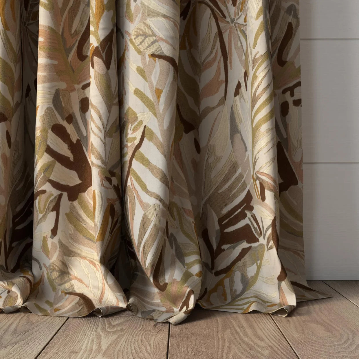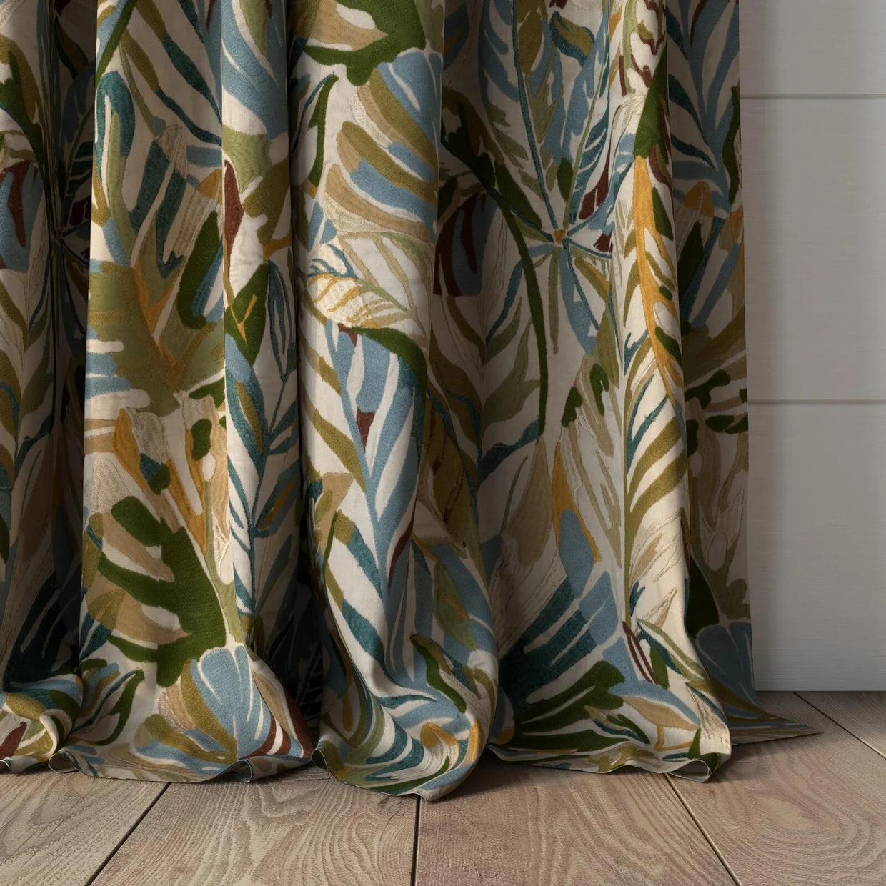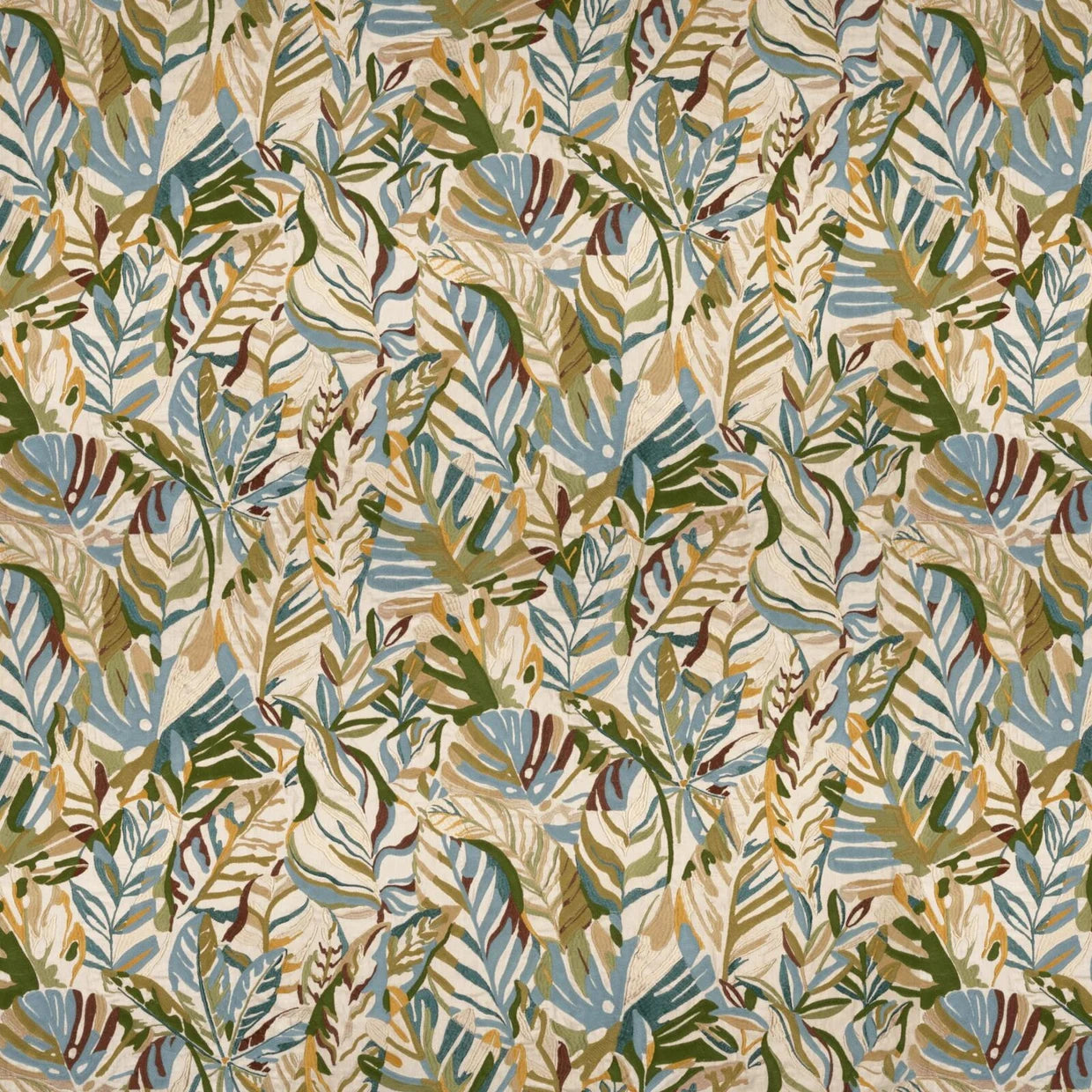 Cordia, our hero design, reimagines tropical foliage in an elevated expression of paradise for the modern interior. A collage of leaves unfurls across the natural linen base cloth, combining crewel chain stitching with a dynamic interplay of matte and lustrous yarns to create depth and tactility. Two rich colourways bring artisanal texture to drapery and accessories. Raffia captures the warm island glow in soft blush, warm gold, and terracotta tones, punctuated by burgundy on a barely-there pink base. Lagoon, by contrast, channels cool, coastal serenity, melding foliage greens with sky blue and ocean teal atop a pumice-hued ground.